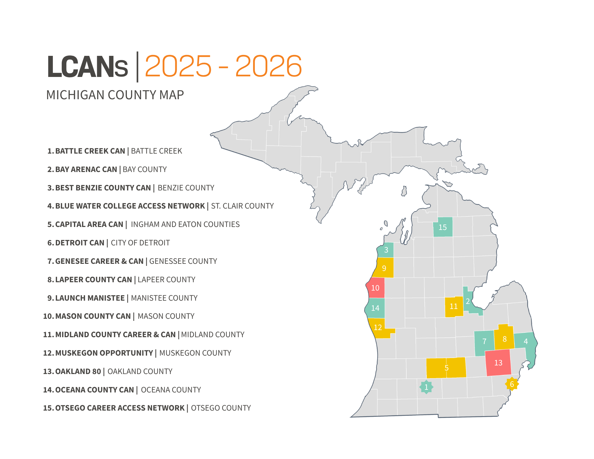 Local College Access Networks (LCANs) are community-based college access alliances supported by a team of community and education leaders representing K-12, higher education, the nonprofit sector, government, business, and philanthropy. These coalitions are committed to building a college-going culture and dramatically increasing college readiness, participation, and completion rates within their community. LCANs coordinate and expand programs, services and resources that lower barriers preventing students from pursuing postsecondary educational opportunities. MCAN serves as the primary support organization to LCANs by providing technical assistance and grant opportunities.